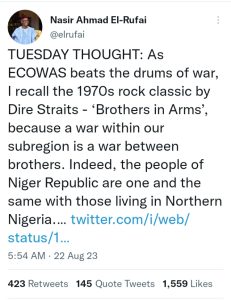 “As ECOWAS beats the drums of war, I recall the 1970s rock classic by Dire Straits – ‘Brothers in Arms’, because a war within our subregion is a war between brothers.