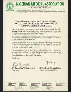 The Plateau State chapter of Nigerian Medical Association (NMA), has distanced itself from a doctor, Noah Kekere, who was recently arrested for allegedly harvesting a woman’s kidney in his hospital in Jos.