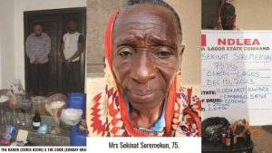 Meanwhile, NDLEA operatives in Lagos on Friday, 15th December, arrested a 75-year-old grandma, Mrs. Sekinat Soremekun, for dealing in illicit drugs. At the time of her arrest in Oshodi area of Lagos, quantities of cannabis and litres of codeine syrup were recovered from her. She claimed her son, Segun, who is now at large supplied her the illicit substances which she retailed.