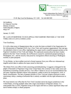The letter outlines the challenges faced by Nigerians attempting to secure passports, emphasizing the urgent need for the establishment of passport printers at Nigerian consulates in New York and Atlanta.