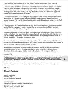 She further stated that “As community leaders, we remain committed to working with your office to ensure the efficient delivery of consular services. However, we need to see a genuine commitment from your ministry to address this issue. Nigerians in the U.S. deserve better.