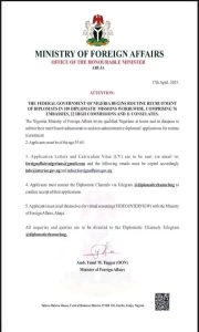 Describing the fraudulent offer as entirely spurious, Ebienfa asserted, “This did not emanate from the Ministry of Foreign Affairs. There is no way you will be recruited into the Nigerian Diplomatic Service without going through the process of training, which is the Foreign Service Academy.”