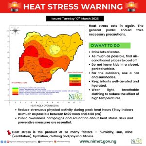 The Nigerian Meteorological Agency (NiMet) has warned Nigerians to take precautionary measures as rising temperatures across the country increase the risk of heat stress in several states.